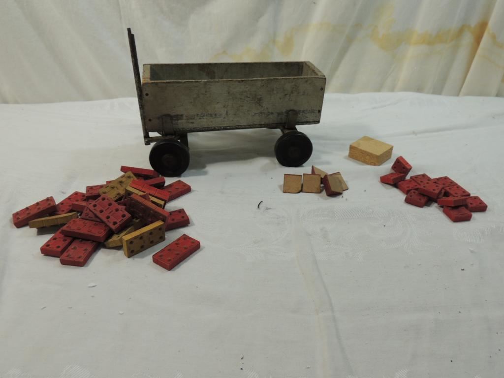 VINTAGE WOODEN CART SMALL CART WITH WOODEN AMERICAN BRICK BUILDING BLOCKS, BILDING TOY, TOY BLOCKS, VINTAGE TOYS, COLLECTIBLE AS SHOWN SEE PHOTO FOR MORE DETAILS