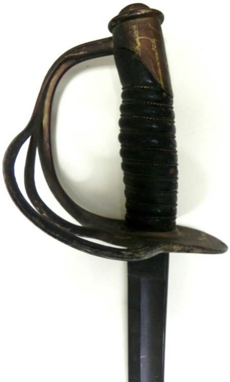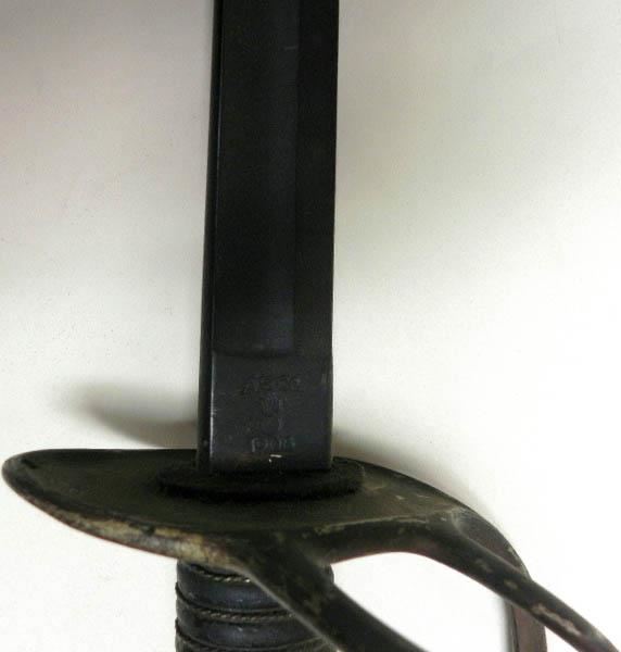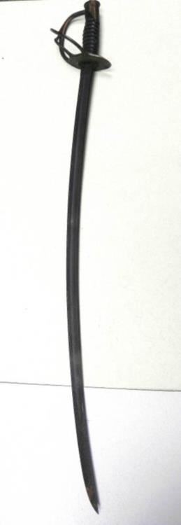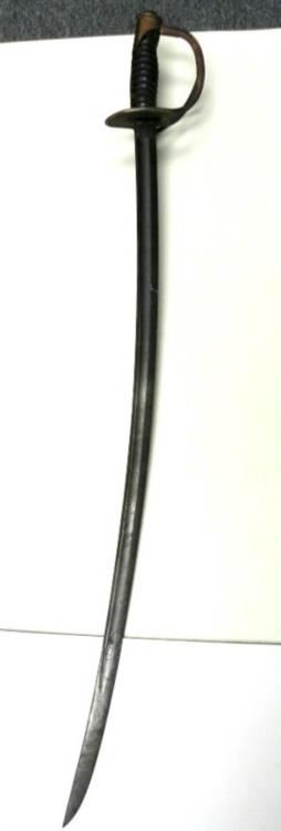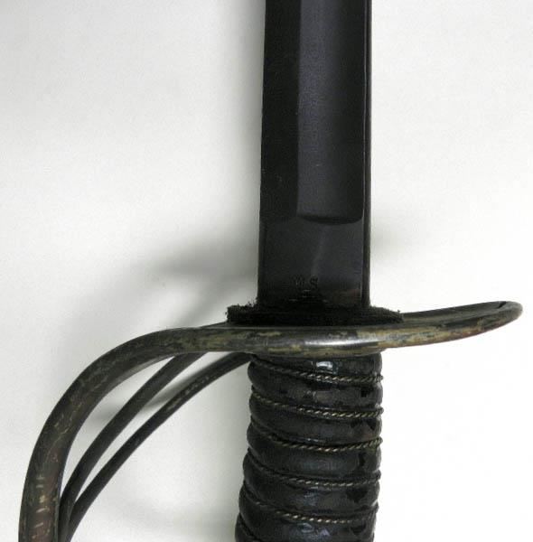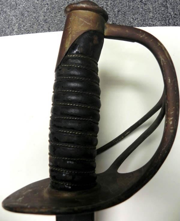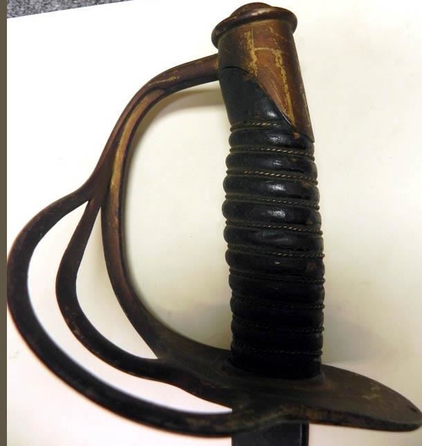 THIS VINTAGE AMES SWORD FOR THE CAVALRY--RICASSO MARKED "ASCO -FLAMING BOMB AND 1906"--REVERSE "US-JHC"--LEATHER GRIP WITH A TIGHT WIRE WRAP--BRASS HAND & CROSSGUARD--BLADE SHOWS AGE, BUT NO DINGS OR CHIPS--NO SCABBARD.