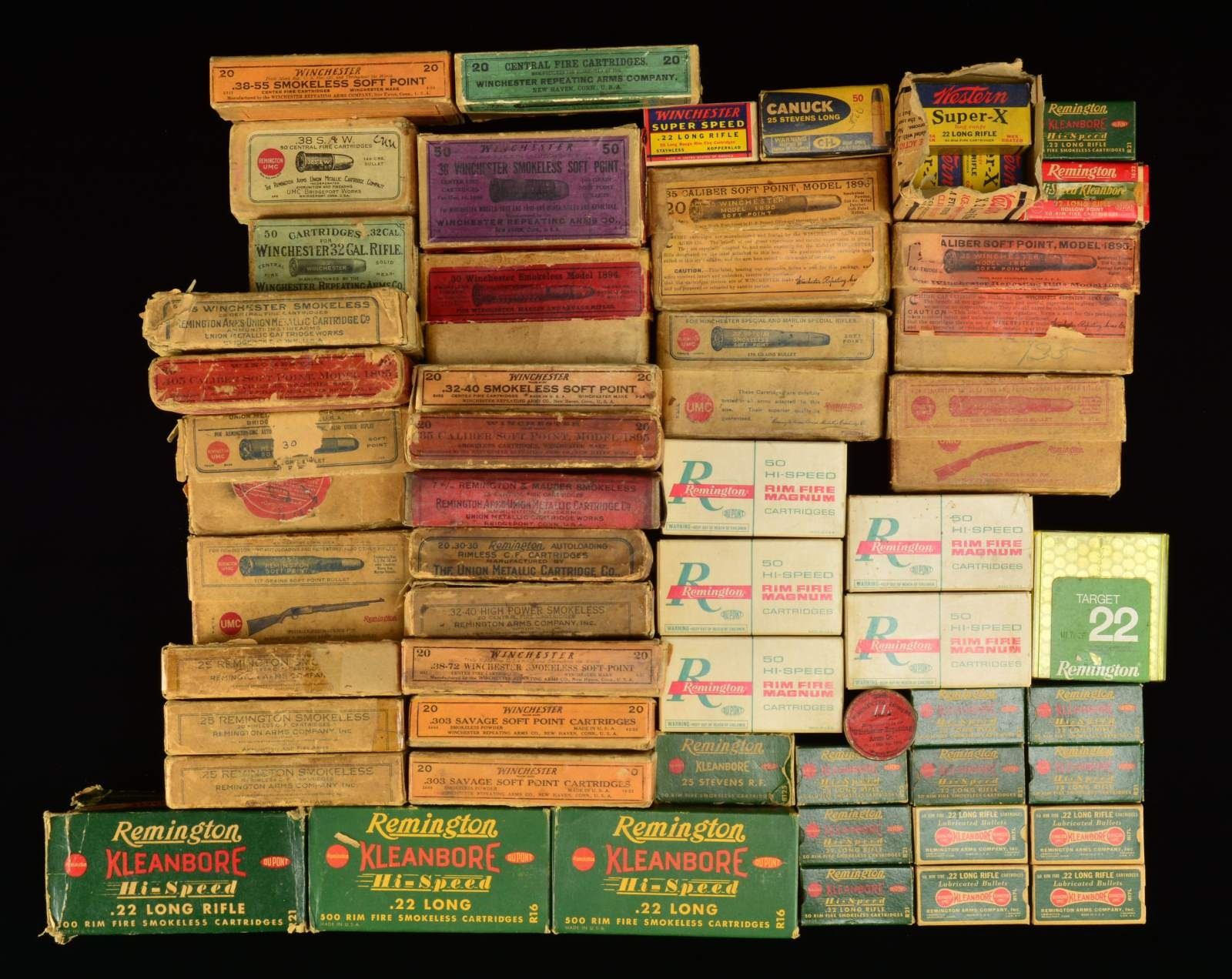 Centerfire ammo in 2 piece boxes. Rimfire ammo. singularly & in bricks. All appears good serviceable ammo. Centerfire: 1/2 Rem. UMC 38 S&W 146 gr. lead / 1/3 box Win. 38 (38-40) 180? gr. SP / Sealed Win. green topped box 32 cal. rifle (32-20) end marked Model 1873 / 4 1/4 Rem. UMC 25 Rem. 117 gr. SP / Rem. 7mm Mauser 175 gr. SP / 1 2/3 Rem. UMC 30 Rem. 170 gr. SP / 1 1/2 Win. 303 Savage 190 gr. SP / 1/2 Win. 30 Win. 30-30 160 gr. Metal Patch / Rem. 30 Army (30-06; 1906) in Win. box missing top / Rem. 32 Spl. 170 gr. SP (mixed brands) / Win. 32-40 (verdigris on cases) 165 gr. SP / Rem. UMC 32-40; 165 gr. SP / 3 Win. 35 cal (for Model 1895) 250 gr. SP / 1/4-1/2 Win. 38-55 255 gr. SP / Win. 38-72 275 gr. SP (very good plus ammo) / Rem. UMC 405 Win. ?gr. SP / Win. red top 405 Win. ?gr. SP / Win. 405 Win. w/ modern copper jacketed bullets in Rem. box / 2 very nice bricks Rem. Kleanbore 22 Long / brick (missing end flap) + 5 1/2 boxes Rem. Kleanbore 22 LR / 3 3/4 Rem. dogbone 22 LR / 3/4 Rem. Klearbore 22 LR HP / Rem. Klearbore red-green box 22 LR HP / 1/2 brick Western ripped blue-yellow box Super X 22 LR / Win. Super Speed 22 LR Koperklad / Rem. blue-green plastic 100 pack 22 LR SV / 5 Rem. 5mm RF 38 gr. HP / 1/2 CIL 25 Stevens Long / 1/2 Rem. Kleanbore 25 Stevens Long / red Win. #2 primer tin w/ approx 20 percussion caps. CONDITION: serviceable ammo. (02-14546-15/NW). $1,000-1,500.
