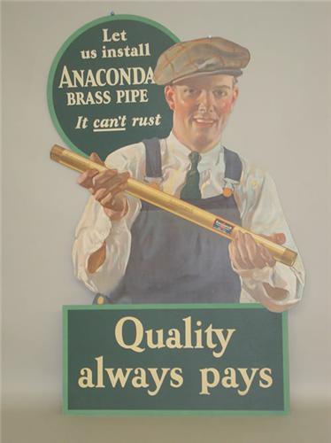 VINTAGE ANACONDA BRASS PIPE FOLDING PAPER BOARD LITHOGRAPH ADVERTISING SIGN "LET US INSTALL ANACONDA BRASS PIPE - IT CANT RUST" W/ OLD TIME PLUMBER & W/ ORIGINAL CARTON (42" X 24")