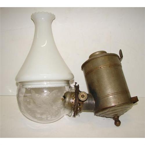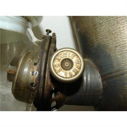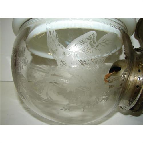 VINTAGE ANGLE MFG. CO. LAMP. Marked on burner “Angle Mfg. Co. NY” and on top of fixture “The Angle Lamp – Co. NY – Patented in the US – And – Foreign Countries”. With original parrot decorated acid etched globe with impressed marks: “Pat. Nov. 6 – 88.”, “No Under Shadow”, “The Angle Lamp Co. NY”. Also with original white glass chimney. Minor chips to collar of chimney. Minor chips to collar and rim of globe. Missing one screw at collar of fixture. Overall height of fixture only, approximately 9”.