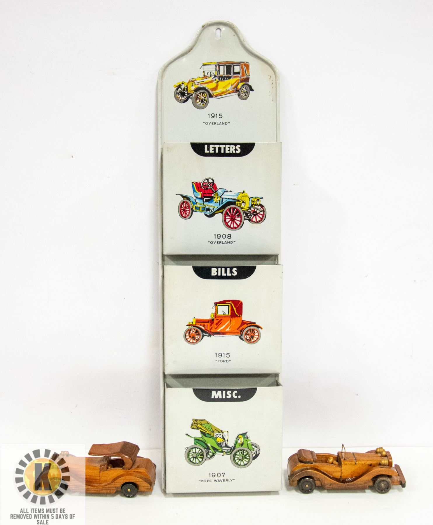 MAIL BOX HOLDER W/2 WOODEN CARSALL ITEMS MUST BE REMOVED WITHIN 5 DAYS OF SALE