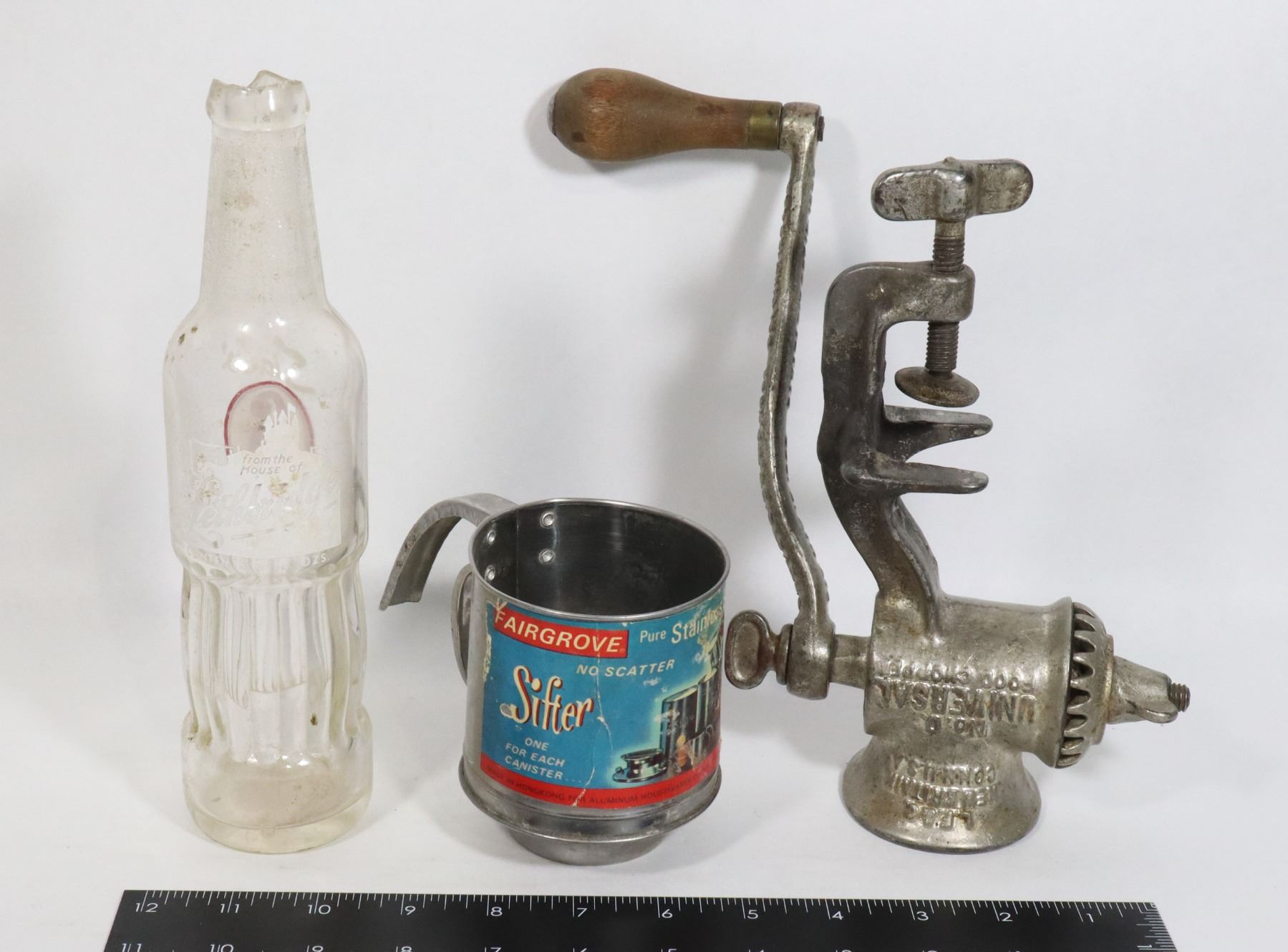 USA NO O UNIVERSAL FOOD CHOPPER, FAIRGROVE SIFTER, AND LETHBRIDGE SICKS' 6 BOTTLE (TOP CHIPPED)
