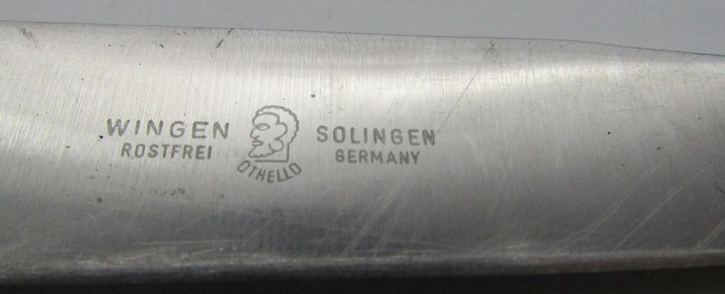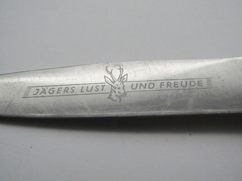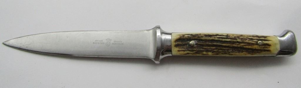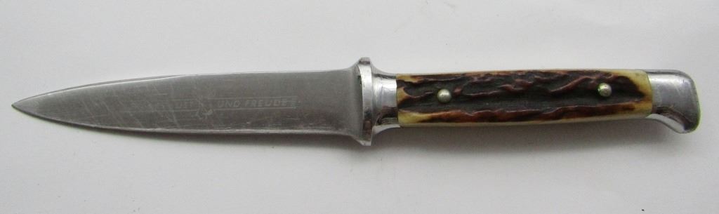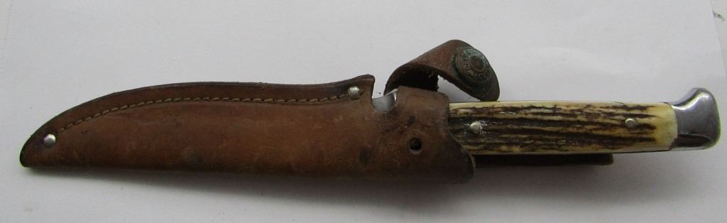 HUNTING KNIFE. STAG HANDLE. SHEATH DOES NOT BELONG WITH THIS KNIFE AND NEEDS NEW BUTTON. BLADE HAS BEEN LIGHTLY SHARPENED. IN OTHERWISE GOOD CONDITION.
