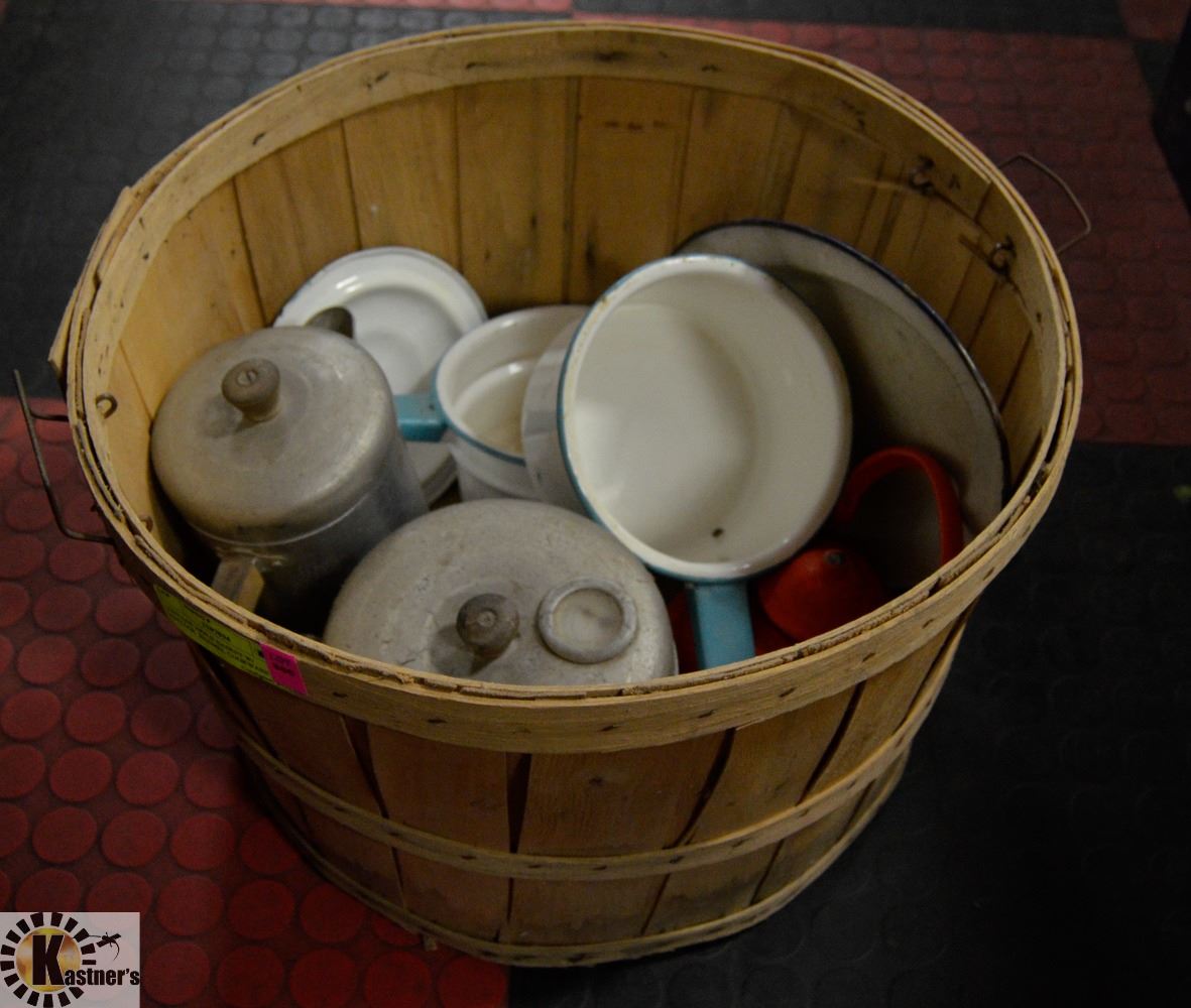 VINTAGE APPLE BASKET W/ VINTAGE ENAMEL COOKWARE