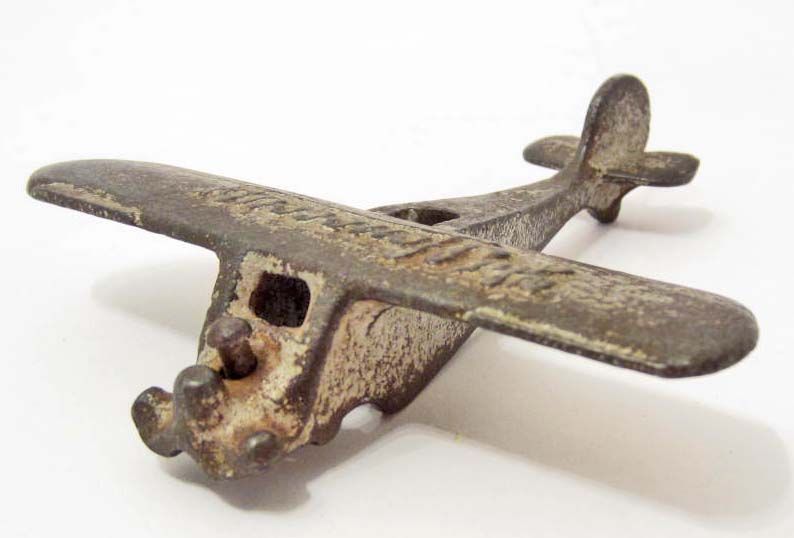 Marked The Monocoupe on top and Arcade 353 under wings. Missing propeller and wheels. There are some chips and scratches out of the paint from play and age.