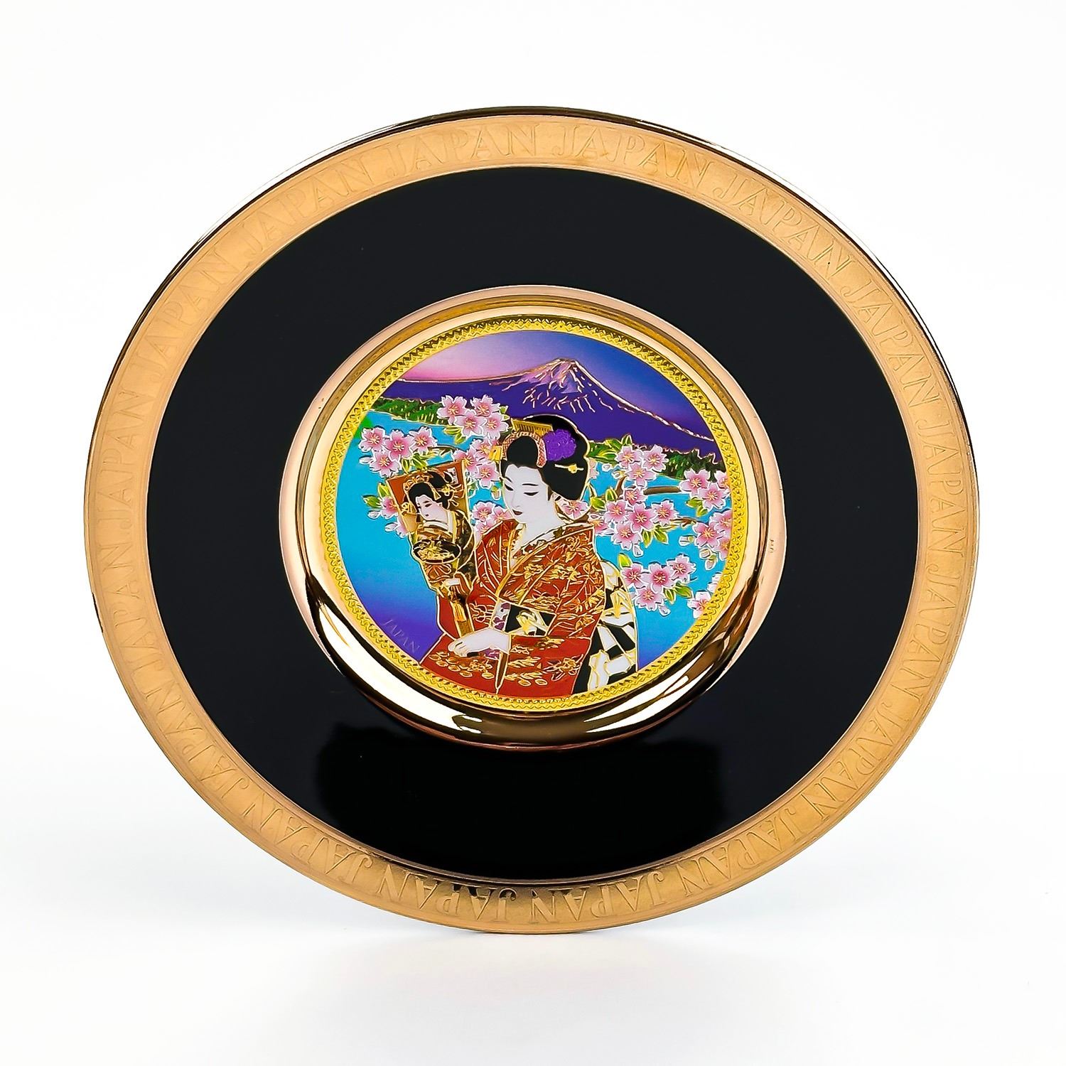 #8203 - GEISHA GIRL THEMED CHOKIN PLATE - GOLD EDGES - MADE IN JAPAN. MEASURES: 6” (15 CM) IN DIAMETER