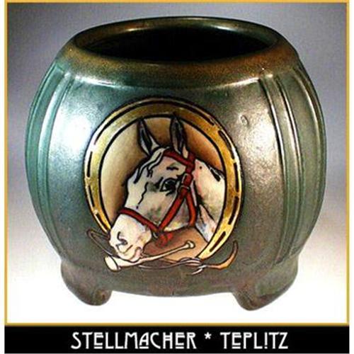 Stunning and unusual Czech Arts and Crafts pottery. Hand painted horse head, whip and horn are surrounded by gold horseshoe on matt green background. The vase is 3 legged with 3 sets of vertical double ribs. Unmarked, except impressed numbers 2383-2, made by Stellmacher/Teplitz. This piece survived its 80 years of existence with no chips, cracks or repairs. Dimensions : 6" W x 4-3/4" H. Please note that in some cases photo sizes are automatically reduced, so if you want to see full size or detailed pictures, please email us.
