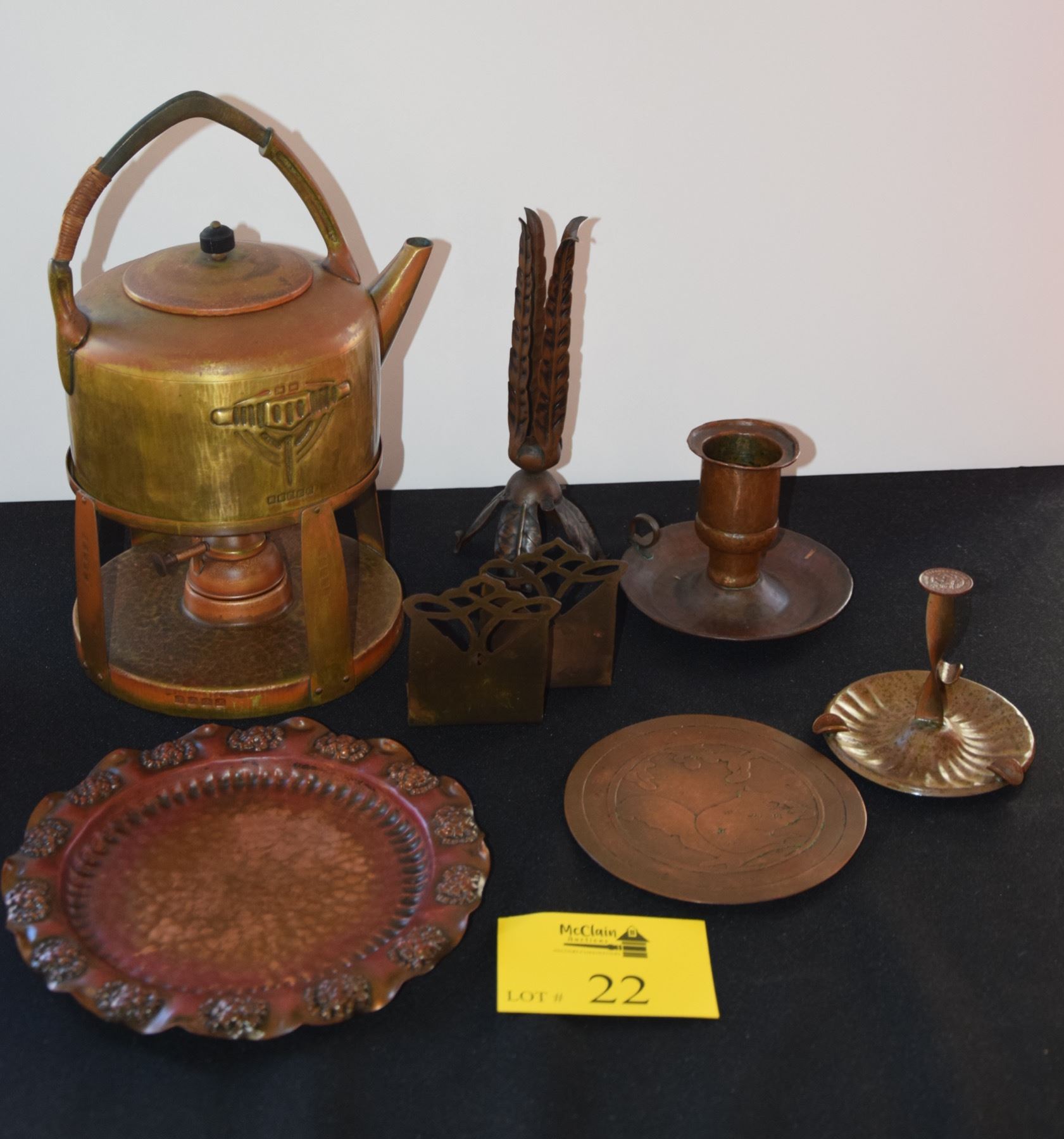 VINTAGE ARTS & CRAFTS HAND WROUGHT & HAMMERED COPPER & METAL SAMOVAR, TRIVET, CANDLE STICK, NAPPIE, BOOKENDS, CENTAVO ASHTRAY & REPOUSSE FLORAL PLATES (10 PCS)