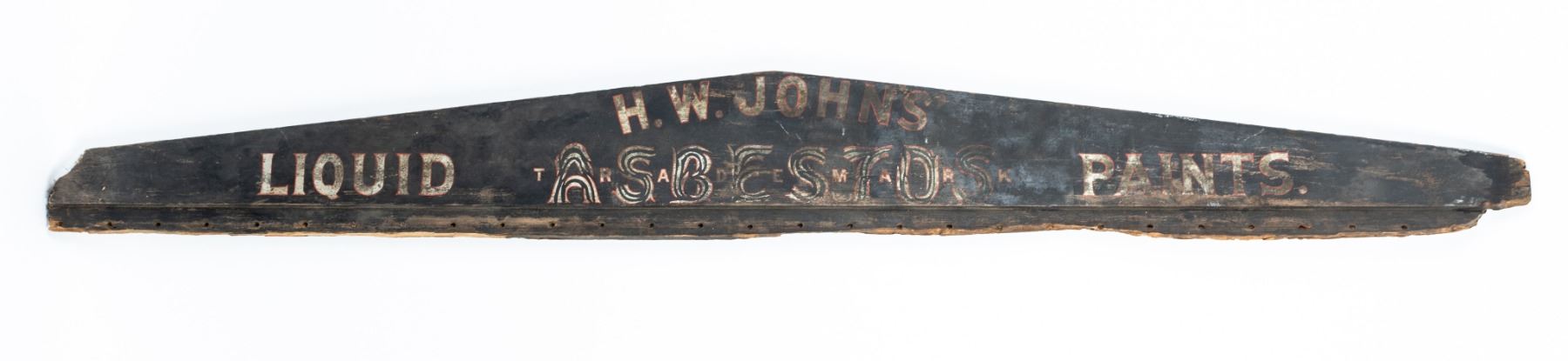 Large painted wooden plaque advertising 'H.W. John's Liquid Asbestos Paint', likely pre-1900. Henry Ward Johns founded the H.W. Johns Manufacturing Company in New York City in 1858. In 1901, the company merged with Manville Covering Company, forming the H.W. Johns-Manville Company, the precursor to Johns Manville, a leading manufacturer in building products. For much of the 20th century, the company was a global leader in the manufacturing of asbestos products. Starting as early as 1929, employees started claiming disability from lung diseases. The claims were settled out of court, with a secrecy order. From the 1960s to the 1980s, the company faced thousands of lawsuits claiming asbestos related illness or injuries. 62.5 x 7.5 inches. Minor damage and loss of wood at underside of plaque and minor paint chipping.