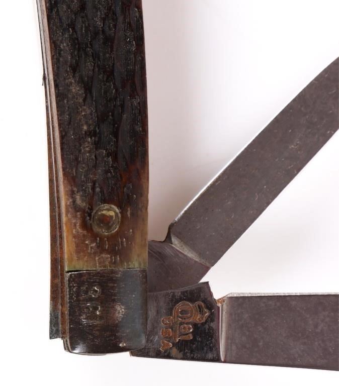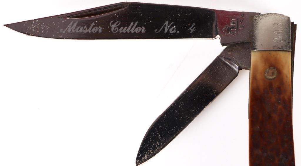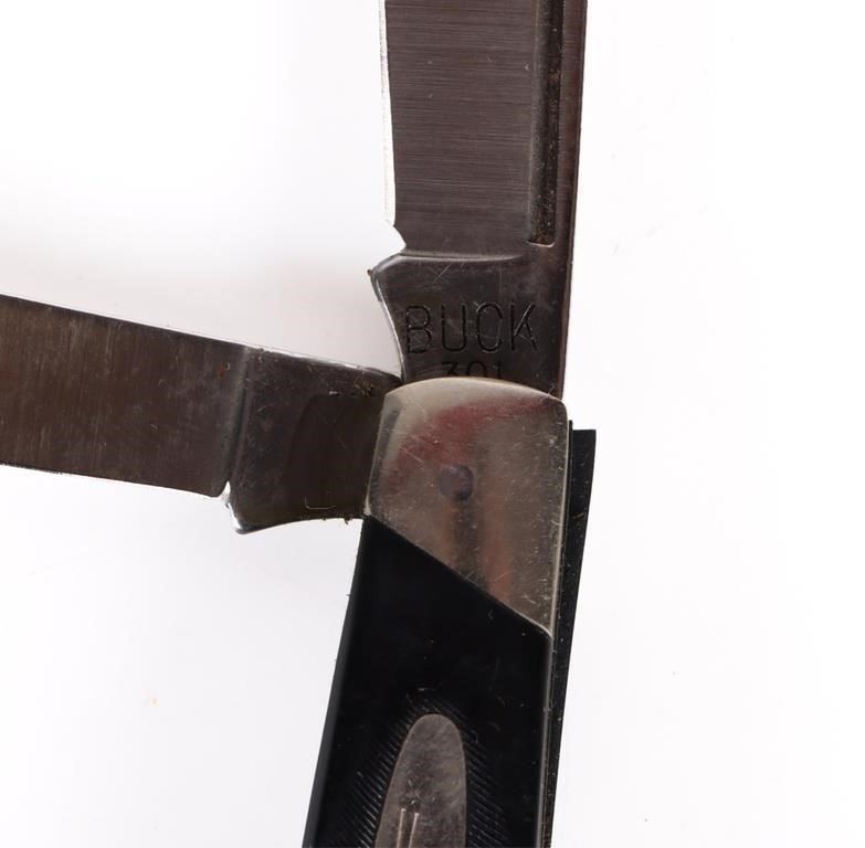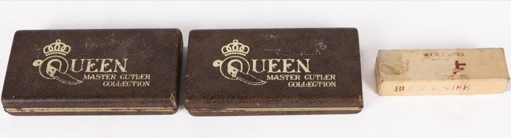 Vintage assorted boxed pocket knives to include one Stockman Buck Knife #301 in original box and two Master Cutler #4 pocket knives by Queen Master Cutler Collection w/ original box.