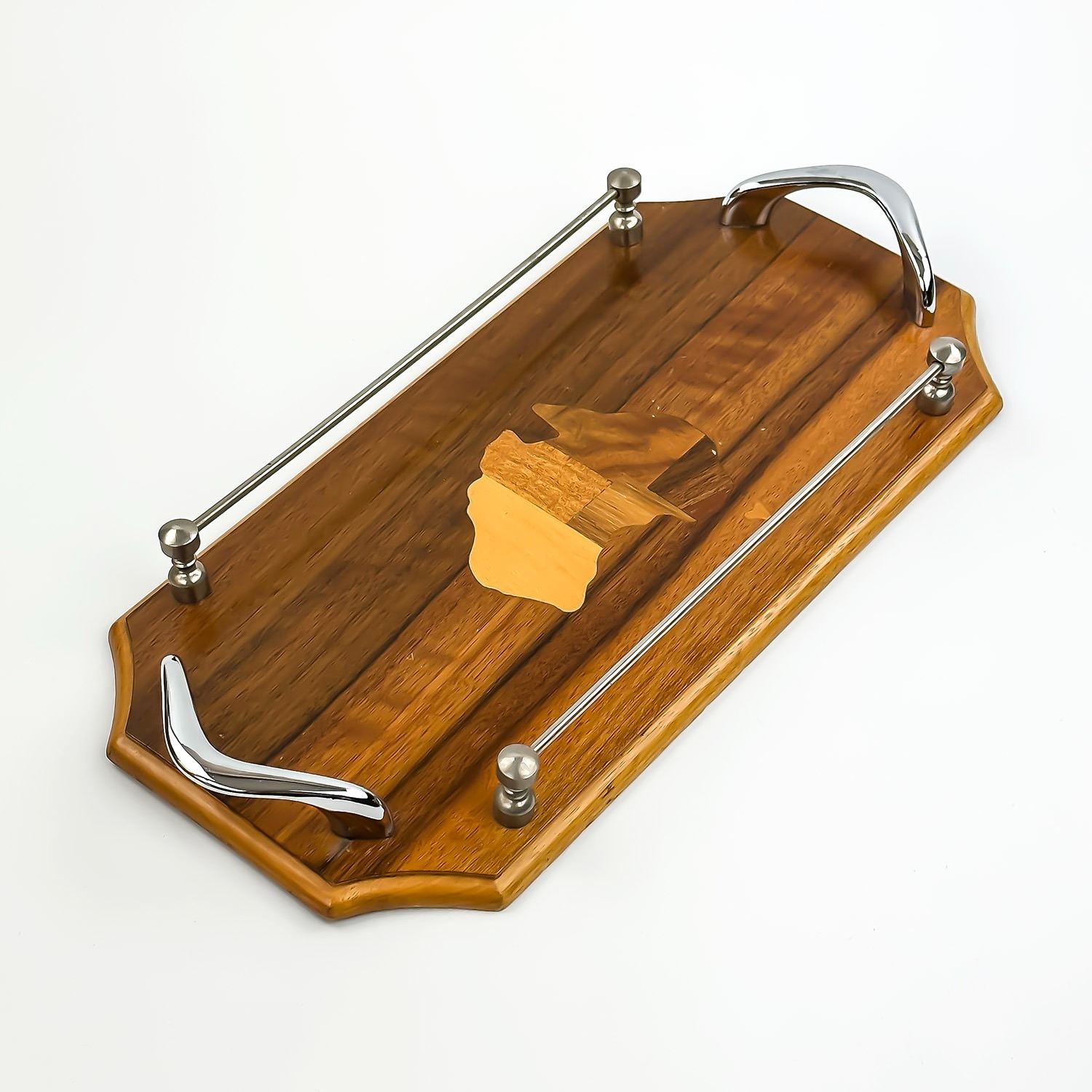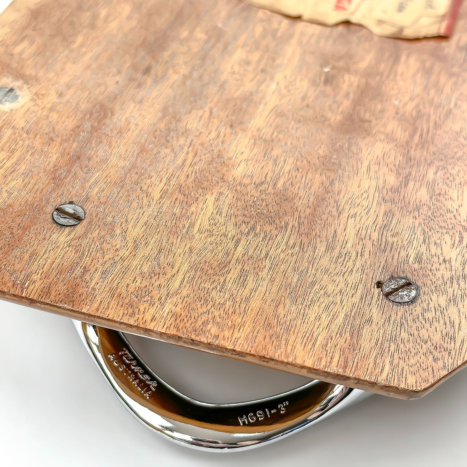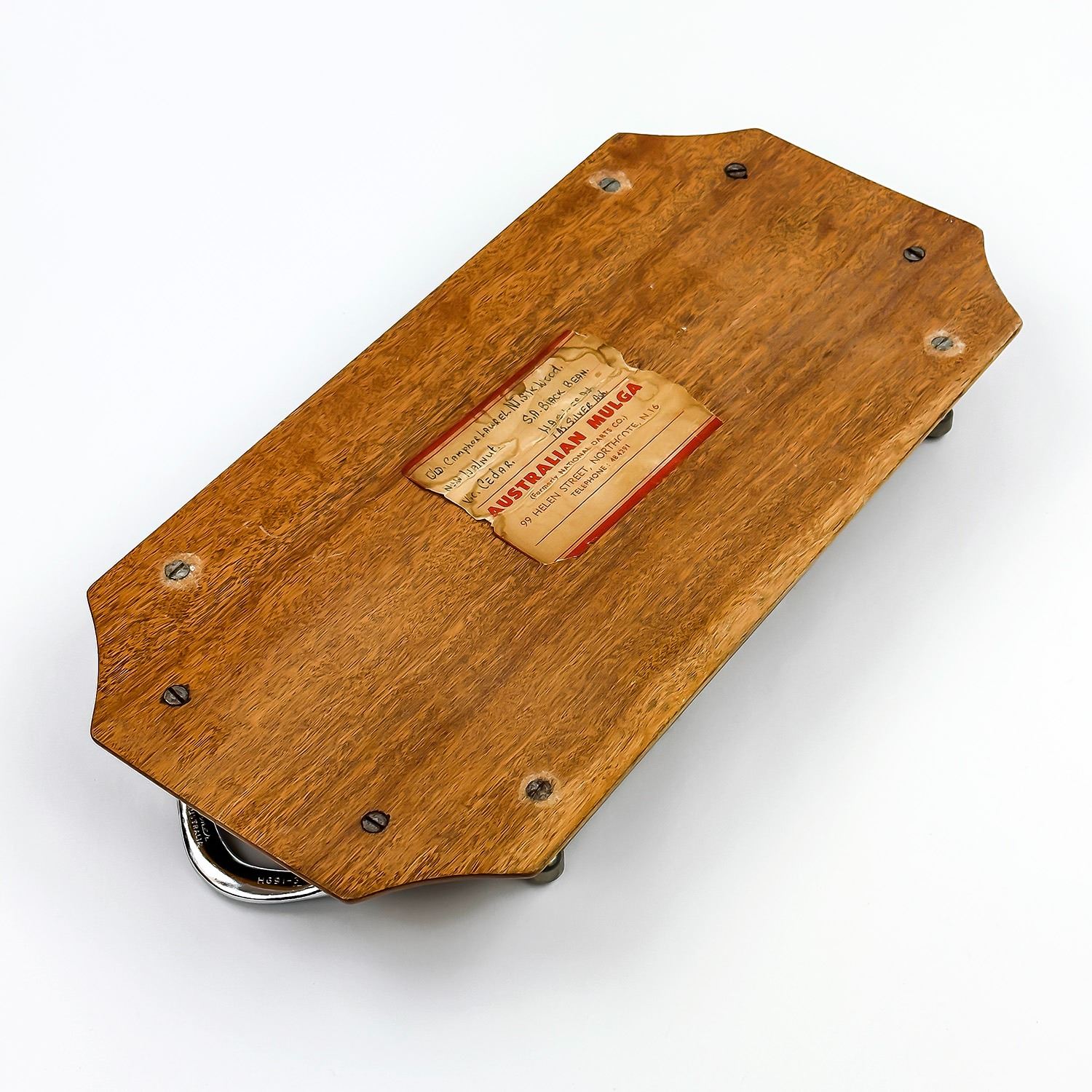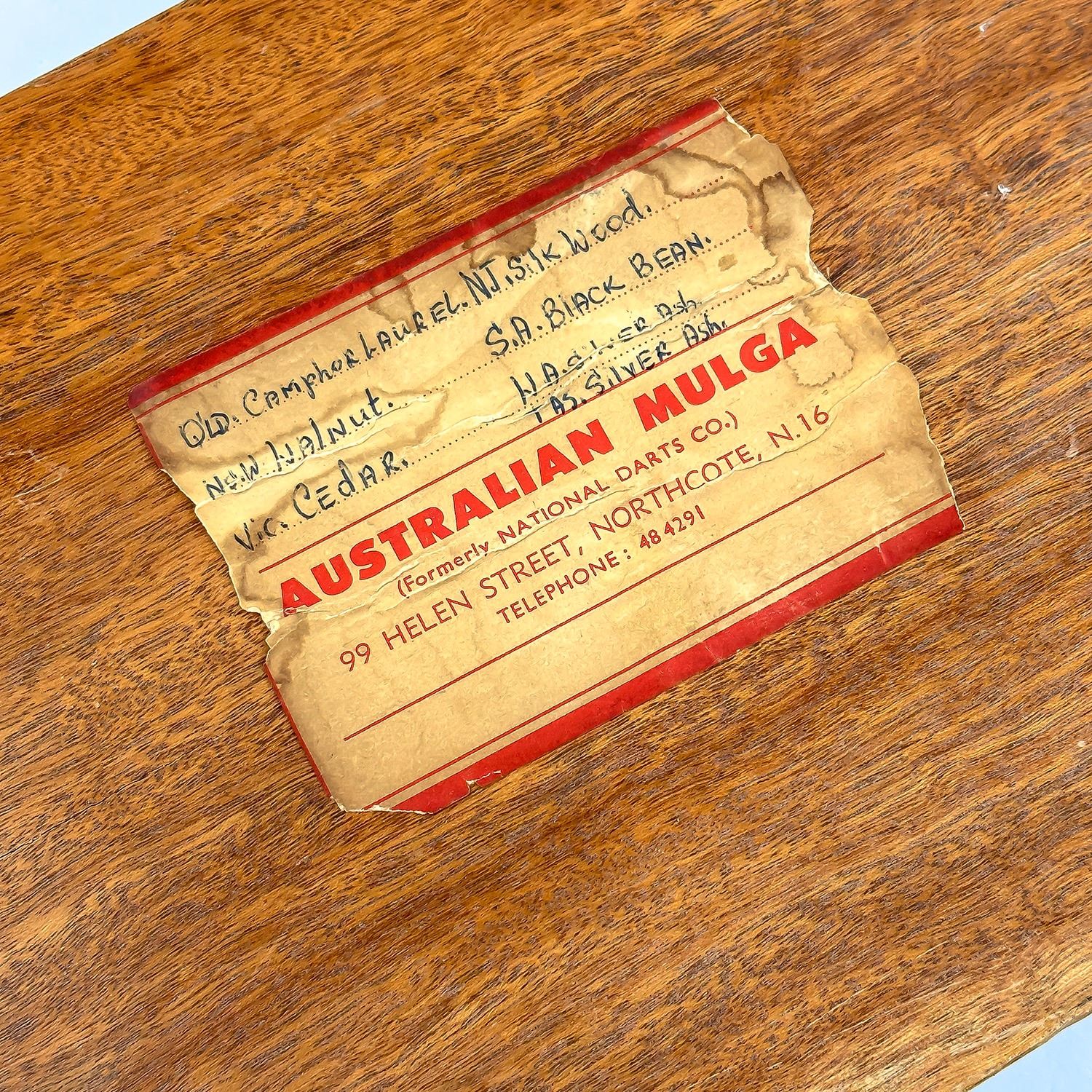 #8265 - MAP OF AUSTRALIA CREATED FROM DIFFERENT SPECIES WOOD - WOOD INLAY. TURNER AUSTRALIA H691-3” BOOMERANG HANDLES. LABEL ON BACK REFERS TO THE SPECIES OF WOOD USED TO CREATE THIS PIECE. TRAY MEASURES: 13.75” (35 CM) LONG BY 1.5” (4 CM)HIGH AND 7***ITEM(S) LOCATED IN LETHBRIDGE ALBERTA. FREE TRANSPORT TO EDMONTON OFFICE AVAILABLE FOR THIS AUCTION. WORLDWIDE SHIPPING IS AVAILABLE FOR ALL ITEMS