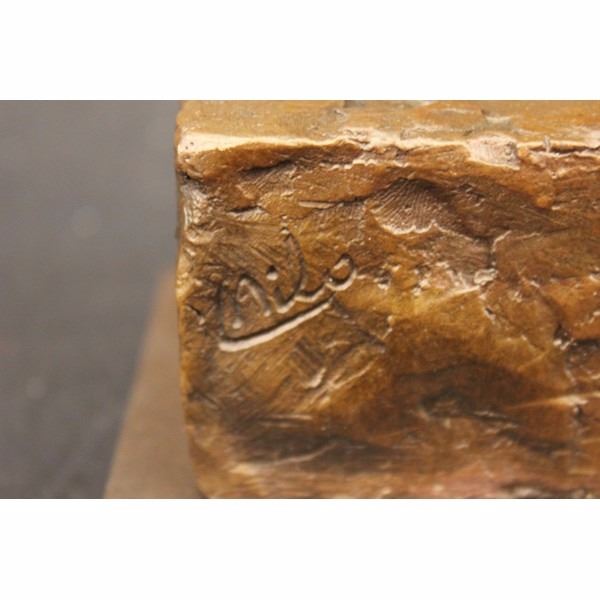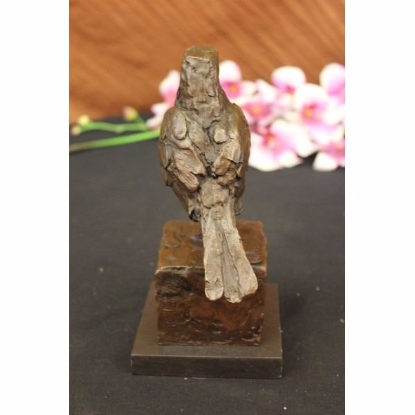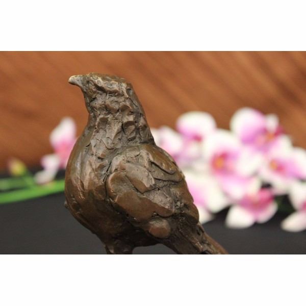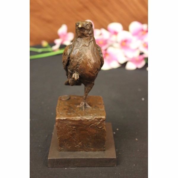 As the lonely cute Sparrow stands on one leg, he looks around attentively for someone to save him. Its almost as if his one foot is stuck in the cement and he curls his other leg up to avoid it from getting stuck in the cement as well. Scientists may beg to differ following the theory that birds stand on one leg to conserve body heat energy. The reason for this is that the legs and the head are the only part of the body that is exposed. But if you look closely atthis Sparrow the left foot is blended into the block not showing any detail of the claws. While looking at the right leg and the foot the claws are curled and pulled toward his chest. The Sculpture is coated with a dark brown patina highlights of gold. The gold highlights give dimension to the sparrow and draw attention to the detail of the feathers in the tail and the beak. This bronze piece was crafted using the Lost Wax Method it is signed by Bugatti, A Noted Spanish artesian who makes all his pieces by hand, and sits atop a square black marble base. Save a sparrow and give him a warm home to stay today. Condition: This sculpture is in very good condition. Bronze Dimensions with Marble Base:Height 8" x Width6" Marble size: 4" X 4" Height without base:7 1/2" Weight : 4 LBS Inventory : 2417K17042