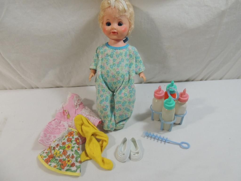 VINTAGE BABY CHRIS DOLL TOY BOTTLES, TOYS, OUTFITS. AS SHOWN SEE PHOTO FOR MORE DETAILS.