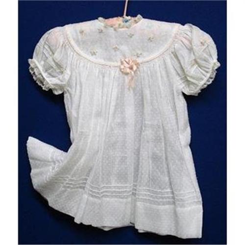 PRETTY BABY DRESS, ADORNED WITH HAND EMBROIDERED ROSEBUDS, LACE AND RIBBONS, as per images - Excellent condition - There is no label or size, measures about 18 1/2" long, from shoulder to shoulder about 10", US Buyer to pay 7.00 for shipping plus insurance.THANKS.
