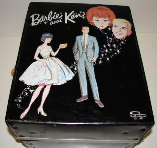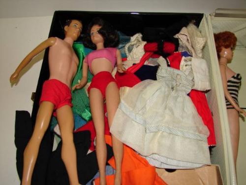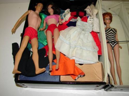 VINTAGE BARBIE CASE AND DOLLS. Contains one male doll and two female dolls as well as an array of clothing.