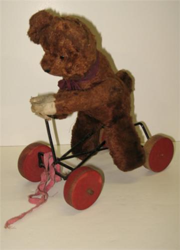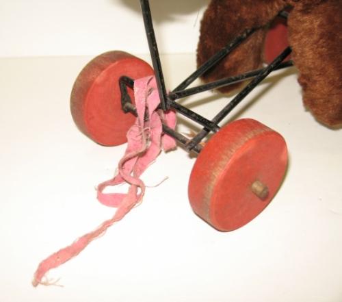 VINTAGE BEAR PULL TOY. Depicts stuffed bear on metal ware frame with wooden wheels and cloth pull. Loss to fur on bear throughout. Bear show signs of extreme wear. 11” H