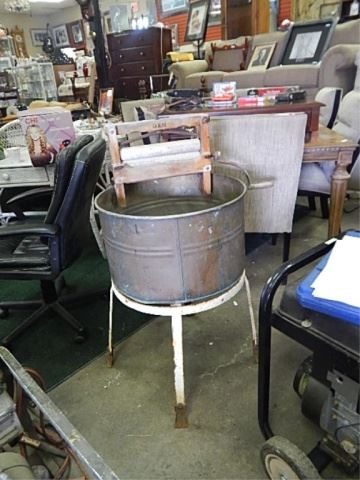 VINTAGE BEATY WASHING COPPER BASIN ON METAL STND - 1920'S? - WITH LATE 1800'S WOOD WRINGER - NO AGITATOR AND MOTOR - WASHER HAS ORIGINAL BEATTY TAGS AND WRINGER HAS GOOD WRITING ON IT......