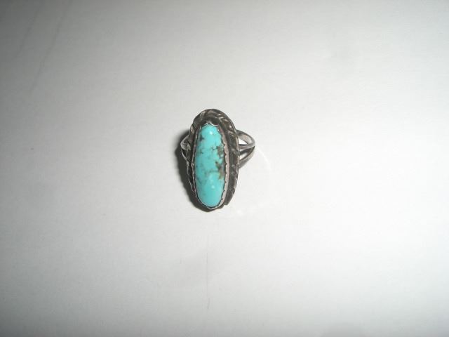 VINTAGE BEAUTIFUL SILVER NAVAHO NATIVE AMERICAN RING SET WITH LARGE TURQUOISE GEMSTONE-RING WEIGHS 4.6 GRAMS AND HAS A VERY NICE UNIQUE DESIGN!! RING CAME OUT OF SAFE!! ***Coin, Currency & All Items Listed in this auction - Grades, Conditions and Values are not Safe Deposit Coins LLC Responsibilty. Grades, Condition and Values are determined by Consigner(s) & Buyers ONLY***
