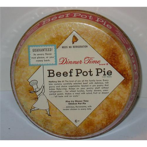 Approx 6" round, tarnished from age, metal BEEF POT PIE tin, c1950s