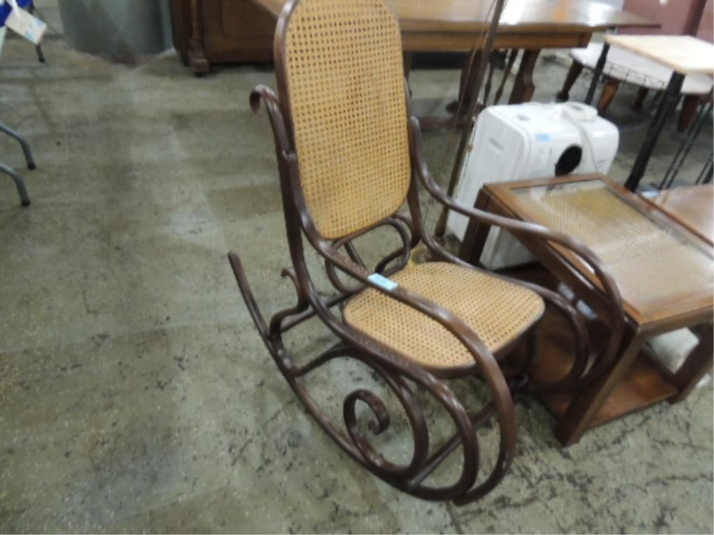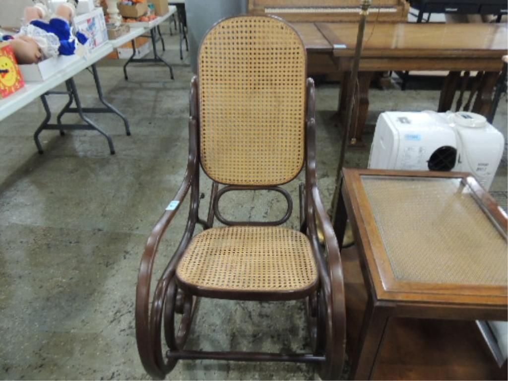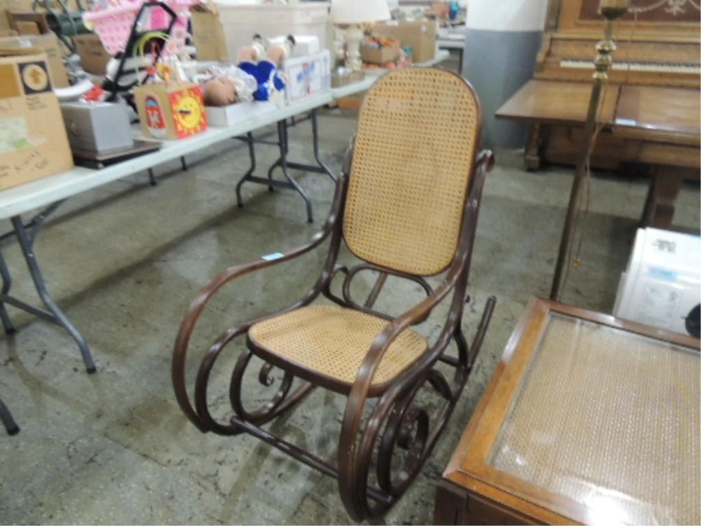 PERFECT, LIKE NEW CONDITION ROCKER IN MAPLE, WITH DARD FINISH AND NICE CANE OR RUSH SEAT, AND IN PERFECT CONDITION. AS SWOWN. SEE PICTURES FOR DETAILS.