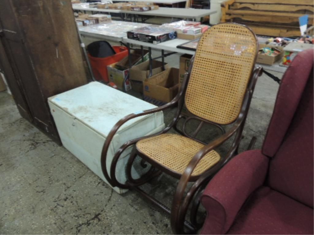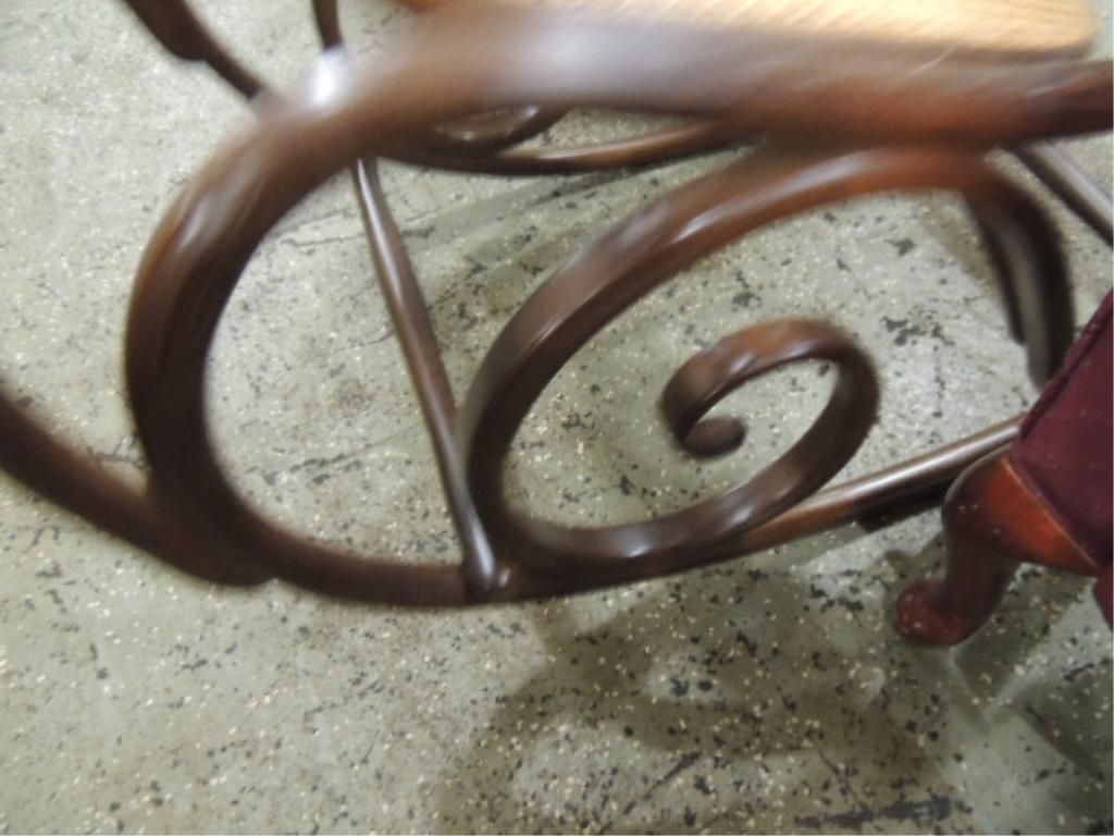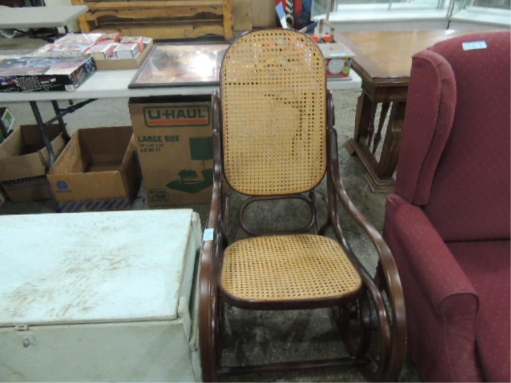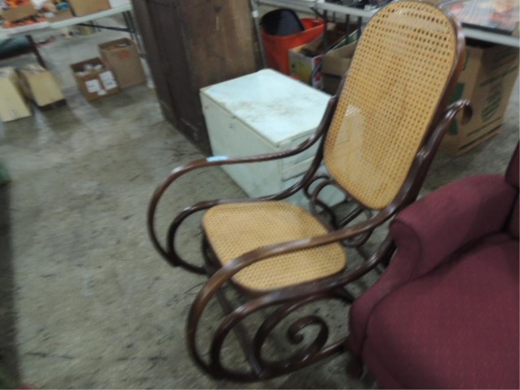PERFECT, LIKE NEW CONDITION ROCKER IN MAPLE, WITH DARD FINISH AND NICE CANE OR RUSH SEAT, AND IN PERFECT CONDITION. AS SWOWN. SEE PICTURES FOR DETAILS.