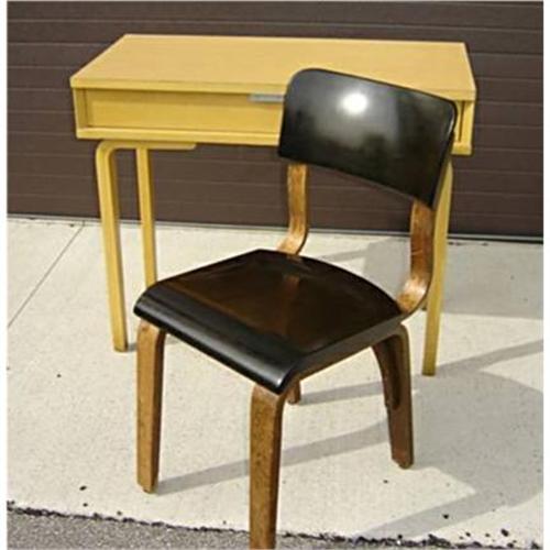 Simple lines, a crisp look and blonde color is a trade mark of this period. This very useful desk has a laminated top, sides and dovetailed drawer with the original pull. The legs are of bentwood and inside the drawer is the Thonet lable. The compaion chair has bentwood legs and back support, with the seat and backrest made of plastic. They are both in good but worn condition. The wood finish on the chair legs and backsupport has a patchy marbled look from age