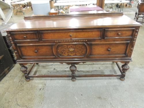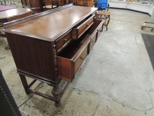 VINTAGE BERKEY FURNITURE CO WALNUT BUFFET 4 DRAWER, 68X22X38. HEAVY CARVED LEGS. 1920S CIRCA. AS SHOWN. VIEW PICTURE FOR DETAIL.