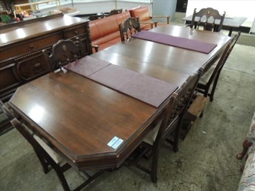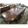 VINTAGE BERKEY FURNITURE CO WALNUT DINING TABLE: 3 10" LEAFS, 5 MATCHING CHAIRS & 1 CAPTAINS CHAIR. HEAVY CARVED LEGS. FULL EXTENSION 96X42. NO LEAFS 66X42. AS SHOWN. VIEW PICTURE FOR DETAIL.