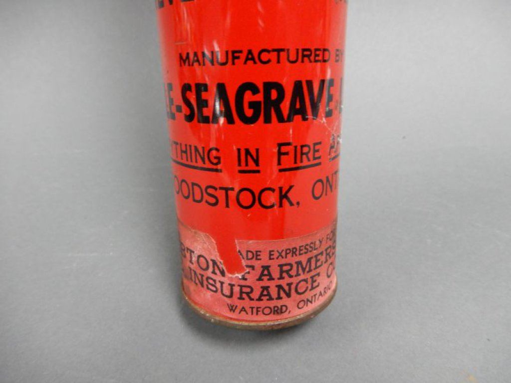 VINTAGE BICKLE-SEAGRAVE FIRE EXTINGUISHER WOODSTOCK, ON - SMALL DENTS- GOOD GRAPHICS LOCATION: LOW