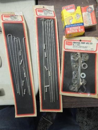 VINTAGE BICYCLE REPAIR PARTS: SPOKES, BRAKE SHOES, KICK STAND, TIRE PATCHES AND MORE. AS SHOWN. VIEW PICTURE FOR DETAIL.