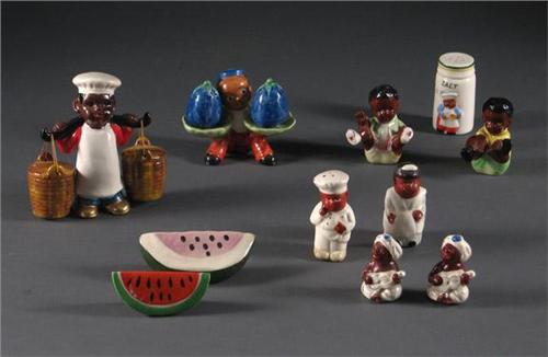 Selection Black Americana figurines to include five sets salt and peppers (cracks, dings, repairs to some), two watermelon-shaped salt shakers, single salt shaker with chef figure in low relief. All mid-20th c.
