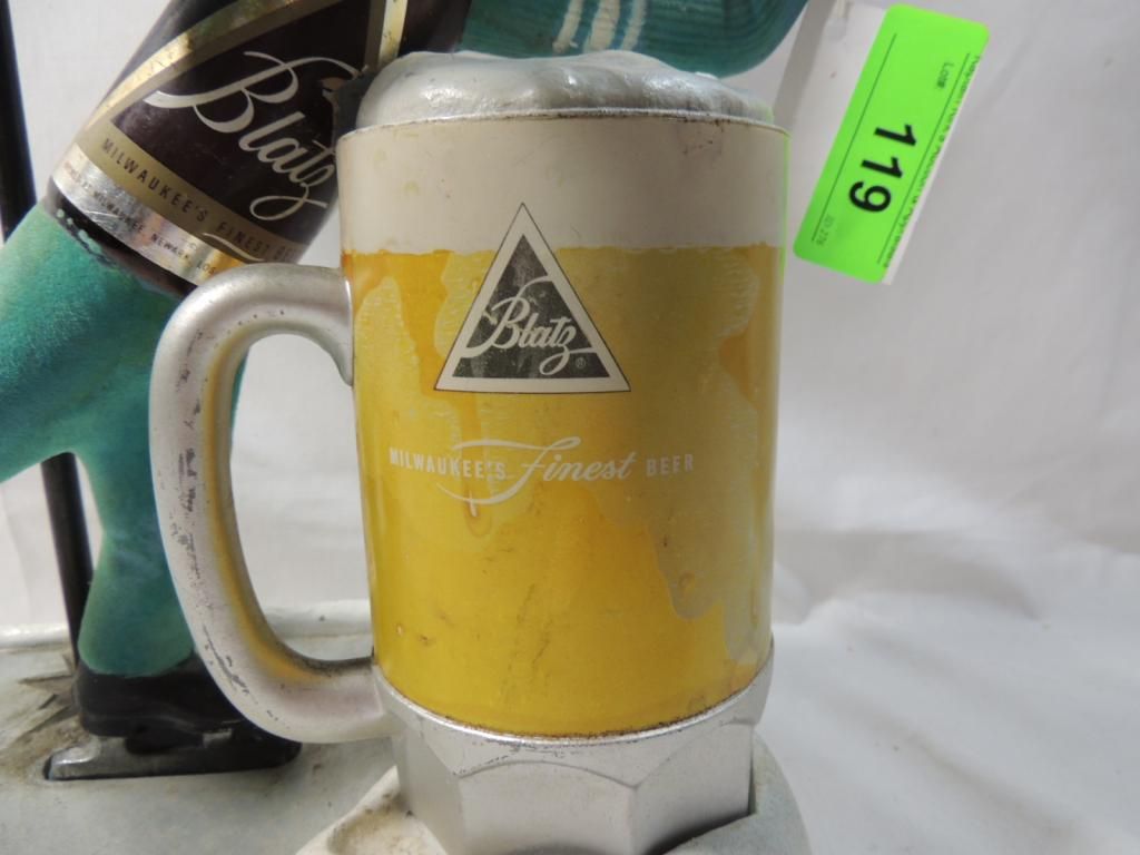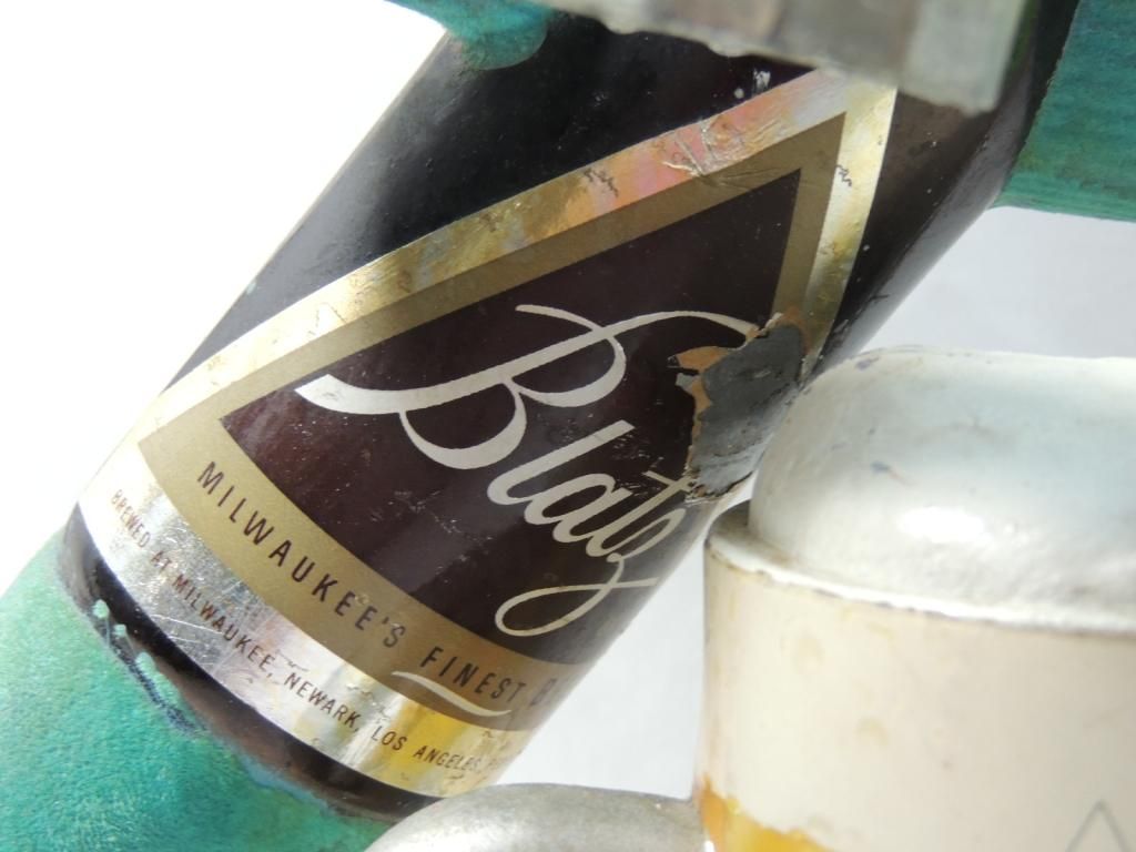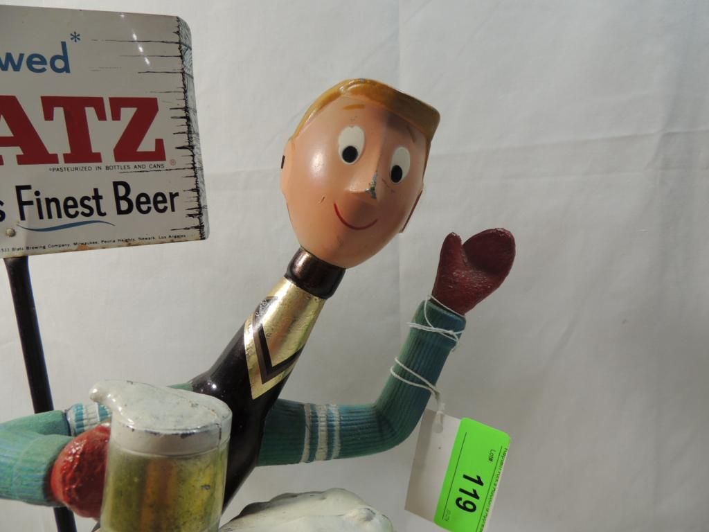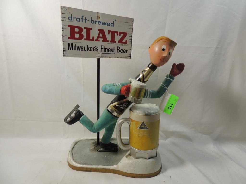 VINTAGE BLATZ BEER SIGN STATUE SKATER. MILWAUKEES FINEST. FINTAGE METAL CAST IRON BEER MEMORABILIA BLATZ BOTTLE SKATER GUYS BEER METAL VINTAGE BREWERY BREWERIANA SIGN