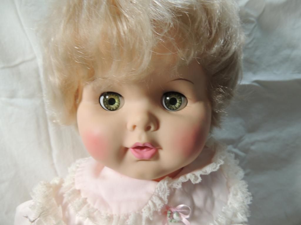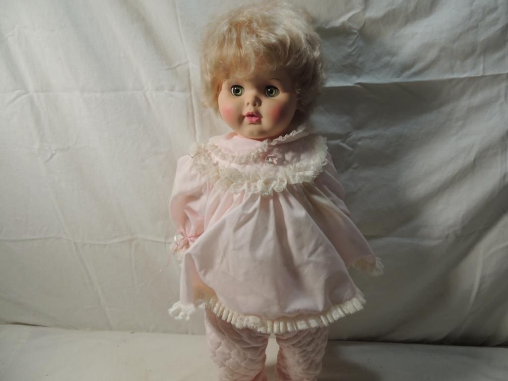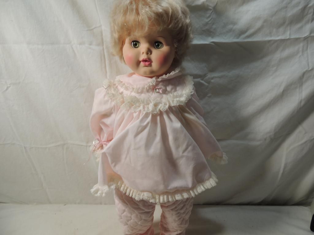 VINTAGE BLONDE DOLL UNMARKED IN PINK PAJAMAS.24" TALL. AS SHOWN. SEE PHOTO FOR MORE DETAILS.
