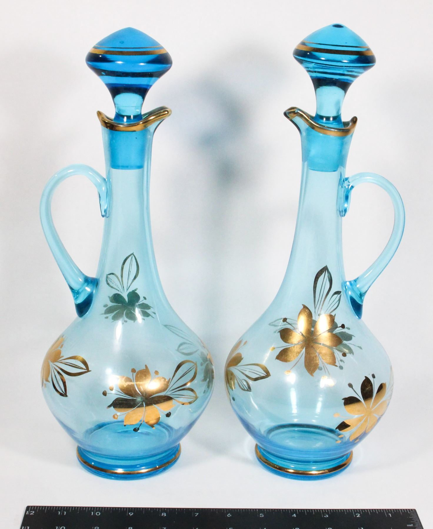 VINTAGE BLUE ART DECANTER GOLD FLOWERS WITH STOPPER. HIGHT 35 INCHES.
