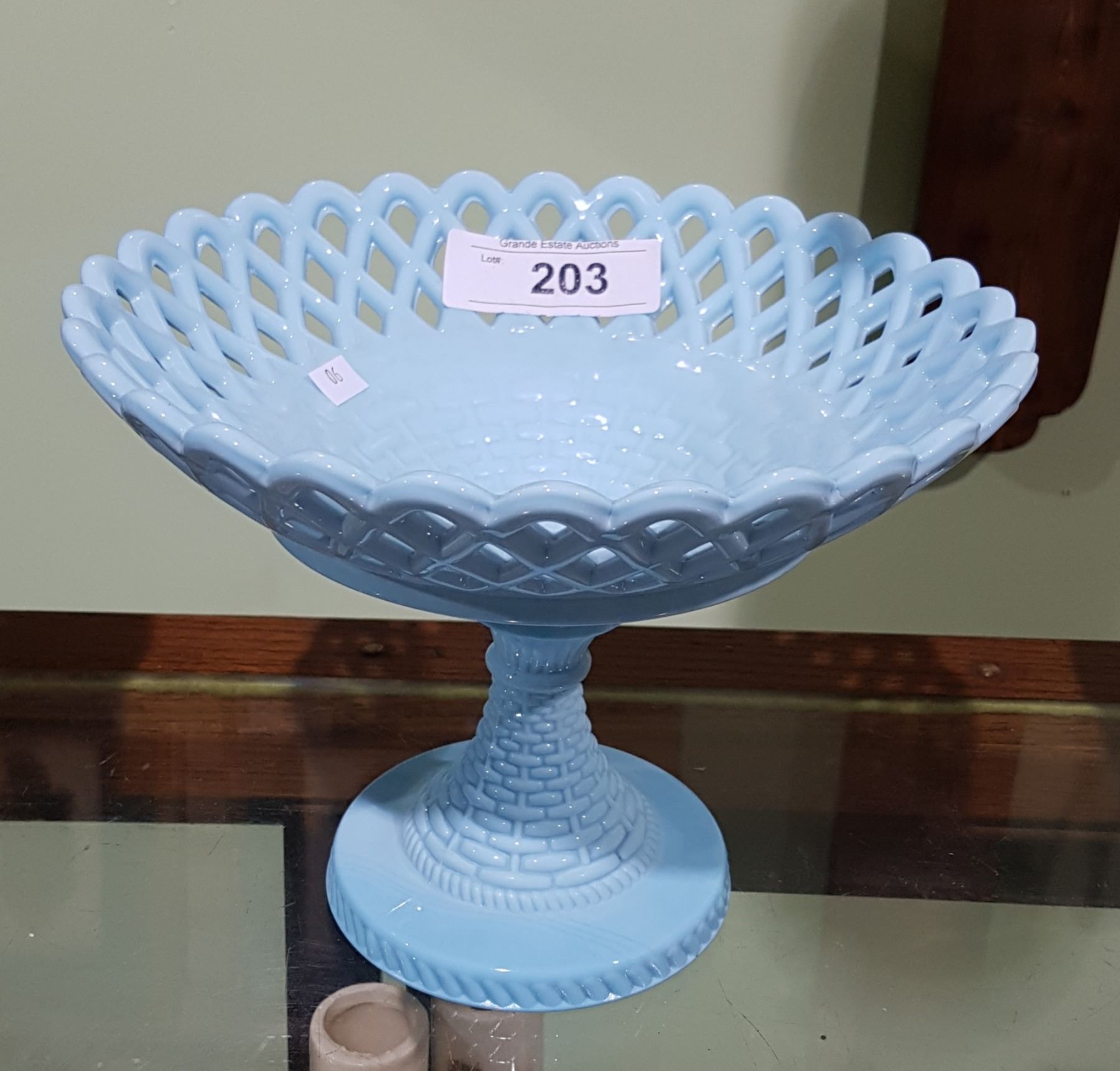 VINTAGE BLUE MILK GLASS COMPOTE W/PIERCED EDGES
