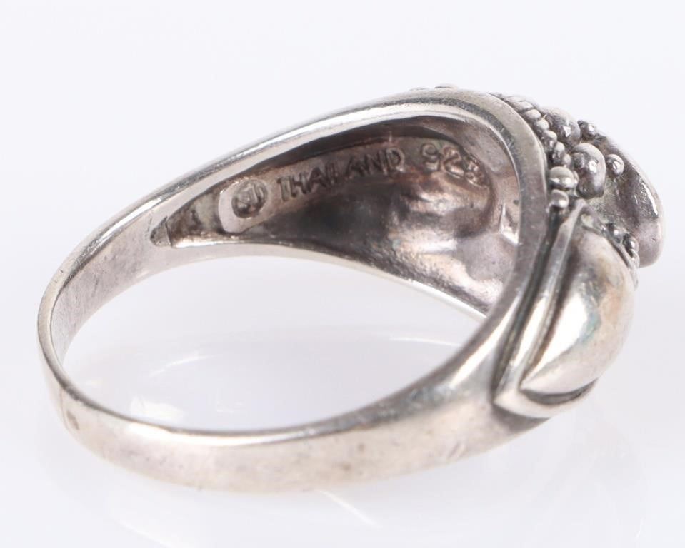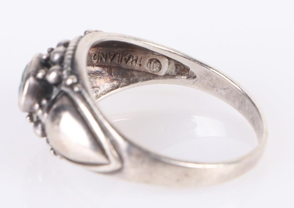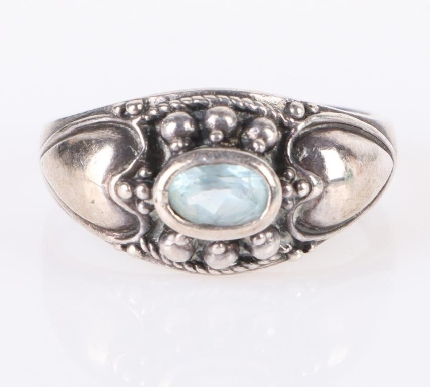 Vintage blue topaz sterling silver ladies ring. Ring has a very unique design with a bubble heart on either side of the oval topaz.