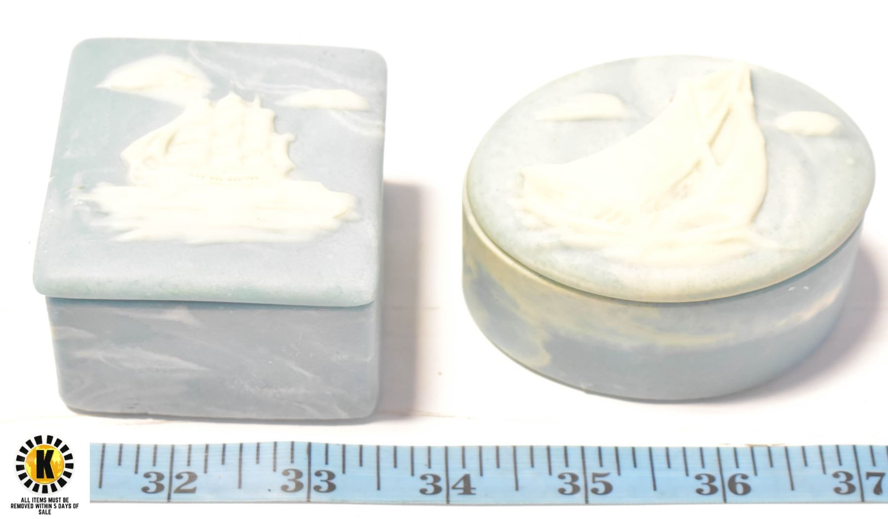 ONE SQUARE AND ONE OBLONG MINI BOXES WITH WHITE SHIP DESIGNS MADE IN USA