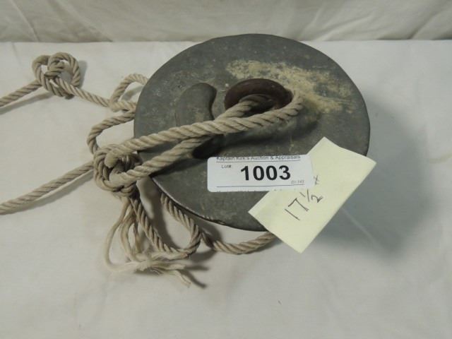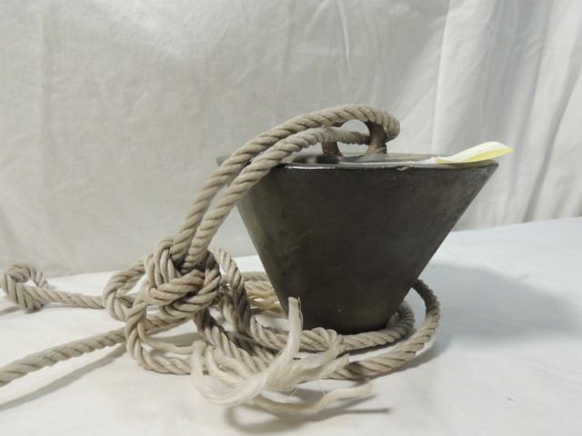 ALL LEAD, WITH EYE AND ORIGINAL VINTAGE ANCHOR ROPE. ABOUT 6" ACROSS AT THE TOP.