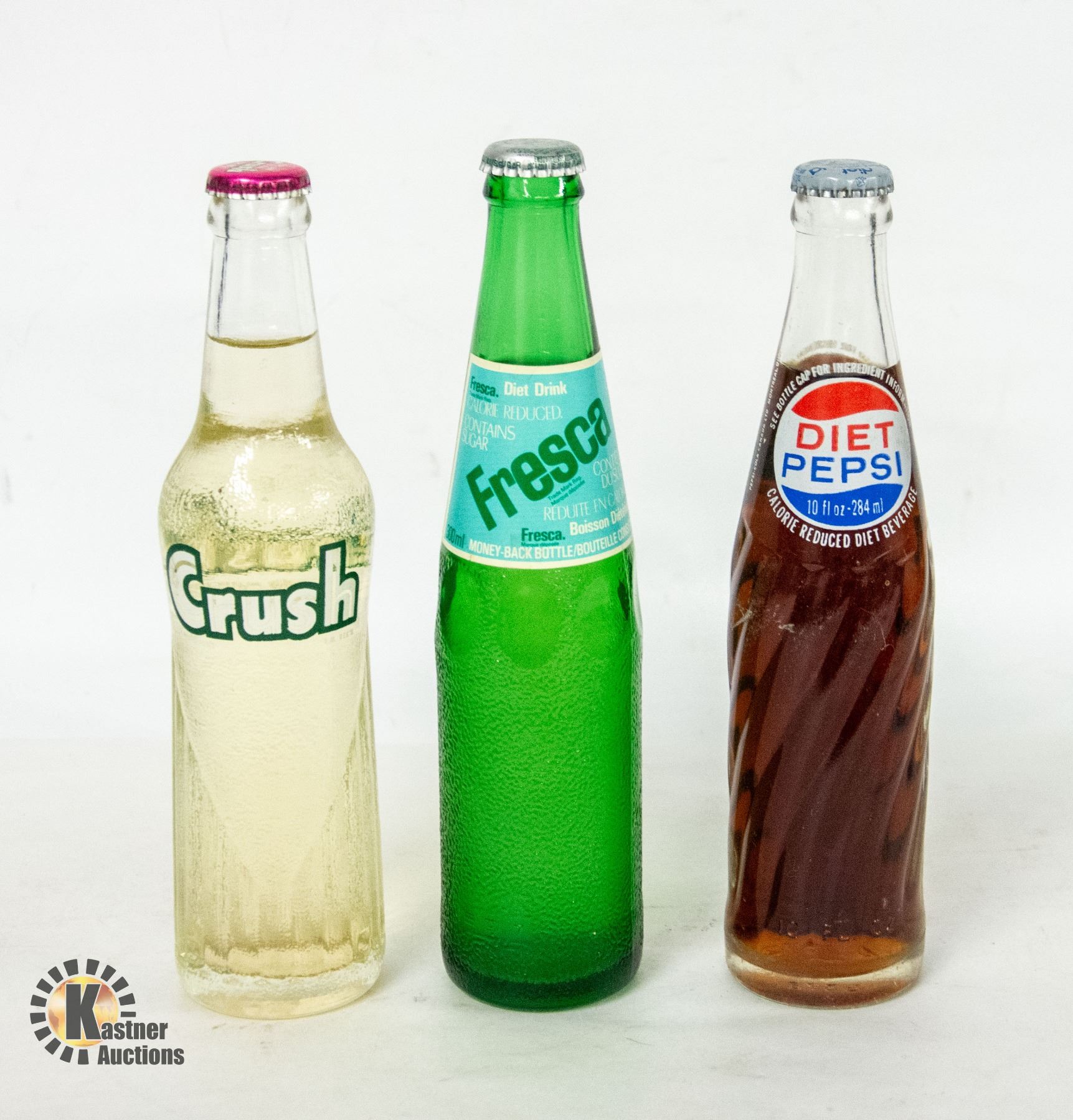 VINTAGE BOTTLED SODA PEPSI, CRUSH & FRESCA 10 OZ