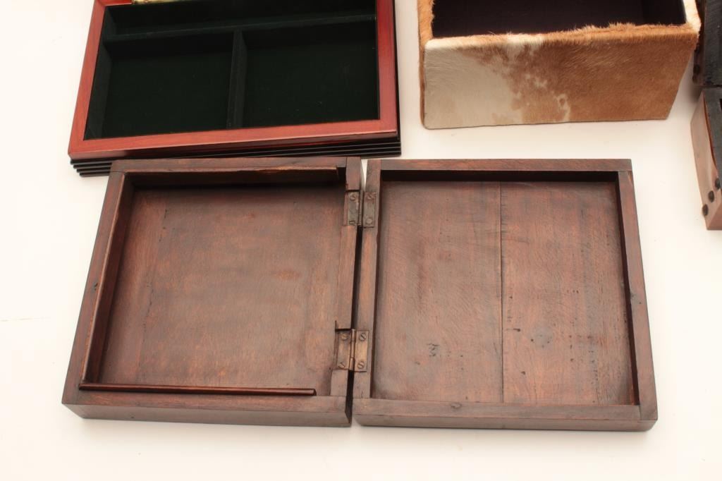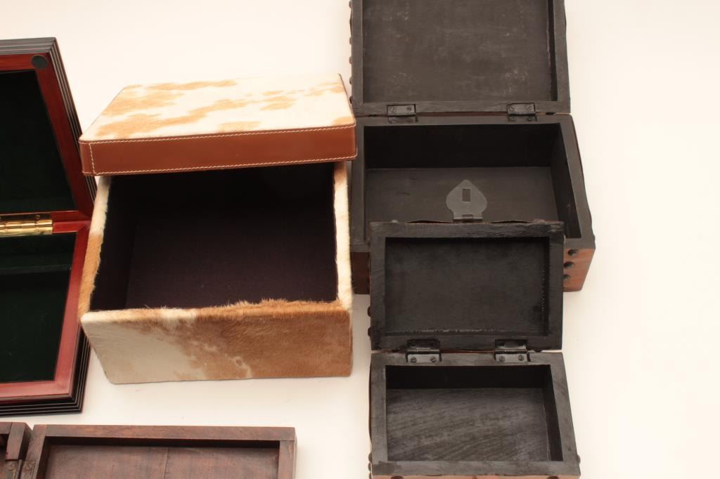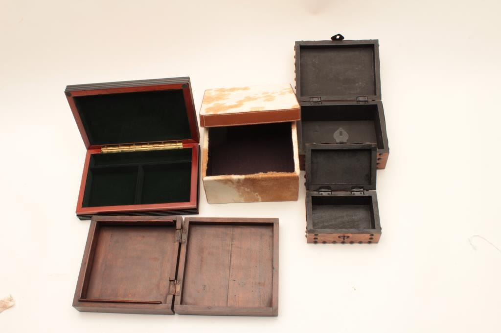 Lot of 5 fancy and vintage boxes A- Fancy Artificial Burl Maple man’s vanity case (Good for pistol case) 11X7X2 ¾ deep/ B- Arts and craft hand made, faux gems in top, 8x8x3 deepC- Copper over wood with 8x5 ¾ by 4 ¼ deep studs and hand made D- Copper over wood 5x6x4 deep E- Cow Hide cover 8x8x4;1/8” Est:$150-300