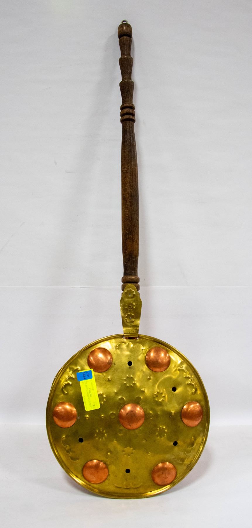VINTAGE BRASS BED WARMER WOODEN HANDLED