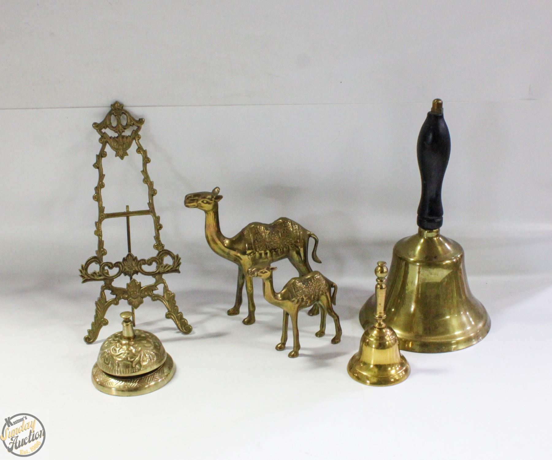 VINTAGE BRASS CAMELS, 3 BRASS BELLS, BRASS EASEL
