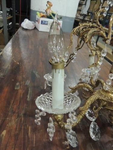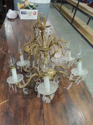 VINTAGE BRASS & CRYSTAL DINING ROOM CHANDELIER. 20"H. COMPLETE. AS SHOWN. VIEWP ICTURE FOR DETAIL