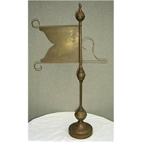 THIS IS A BEAUTIFUL AND INTERESTING PIECE. IT MAY HAVE HELD FABRIC THROUGH THE TAIL TO DRAPE AND DISPLAY IT TO AN ADVANTAGE. IT IS MADE OF BRASS WHICH NOW HAS A BEAUTIFUL PATINA. ALL IS IN GOOD CONDITION. UNDERNEATH THE BASE IS AN 'L' SHAPED PIECE OF IRON WHICH PROBABLY SECURED IT FOR DISPLAY. IT IS A BEAUTIFUL DECORATIVE PIECE TODAY WITH A GOOD VISUAL IMPACT.