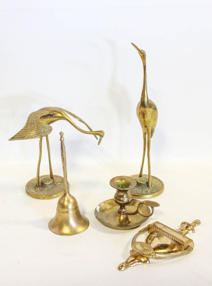 VINTAGE BRASS DOOR KNOCKER, CANDLESTICK HOLDER,