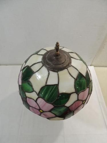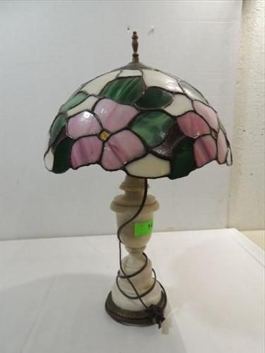 VINTAGE BRASS & MARBLE BASE LAMP, SLAG GLASS SHADE. 21"H. NO MAKER MARKS. AS SHOWN. VIEW PICTURE FOR DETAIL.