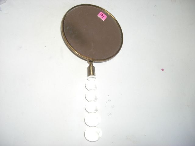 VINTAGE BRASS MIRROR WITH GLASS HANDLE AND FLOWER DESIGN ON BACK OF MIRROR!! MIRROR CAME OUT OF SAFE!! ***Coin, Currency & All Items Listed in this auction - Grades, Conditions and Values are not Safe Deposit Coins LLC Responsibilty. Grades, Condition and Values are determined by Consigner(s) & Buyers ONLY