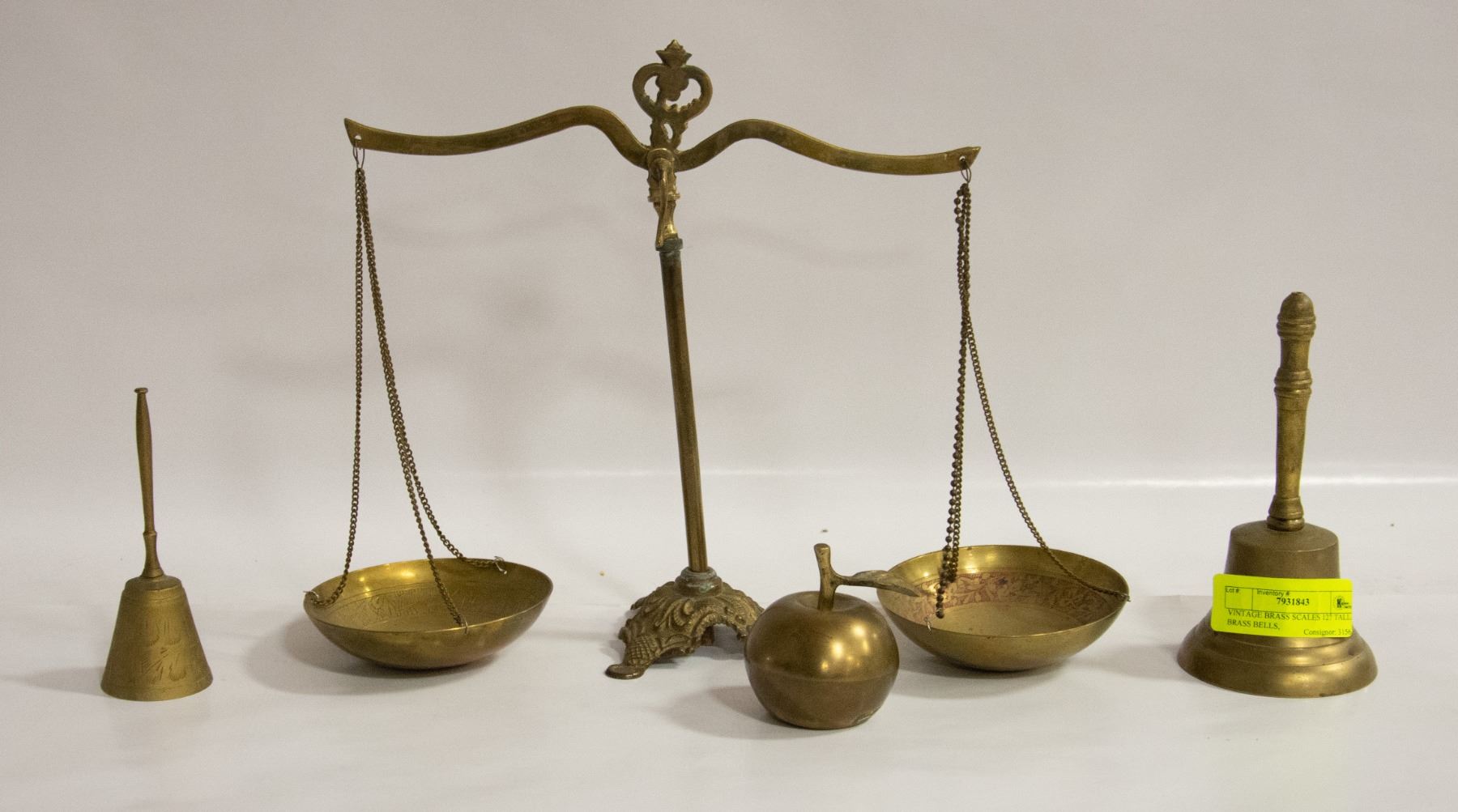 VINTAGE BRASS SCALES 12" TALL, BRASS BELLS,