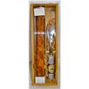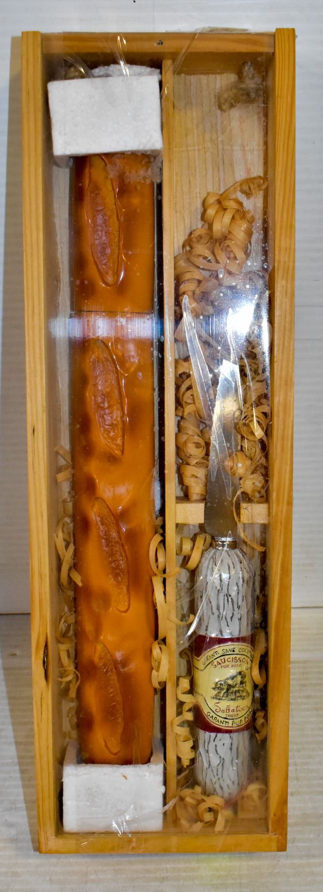 A CASE AND HANDLE THAT LOOKS LIKE LOAF OF BREAD AND THE SAUSAGE KNIFE HAS A HANDLE THAT LOOKS LIKE A ROLL OF SAUSAGE